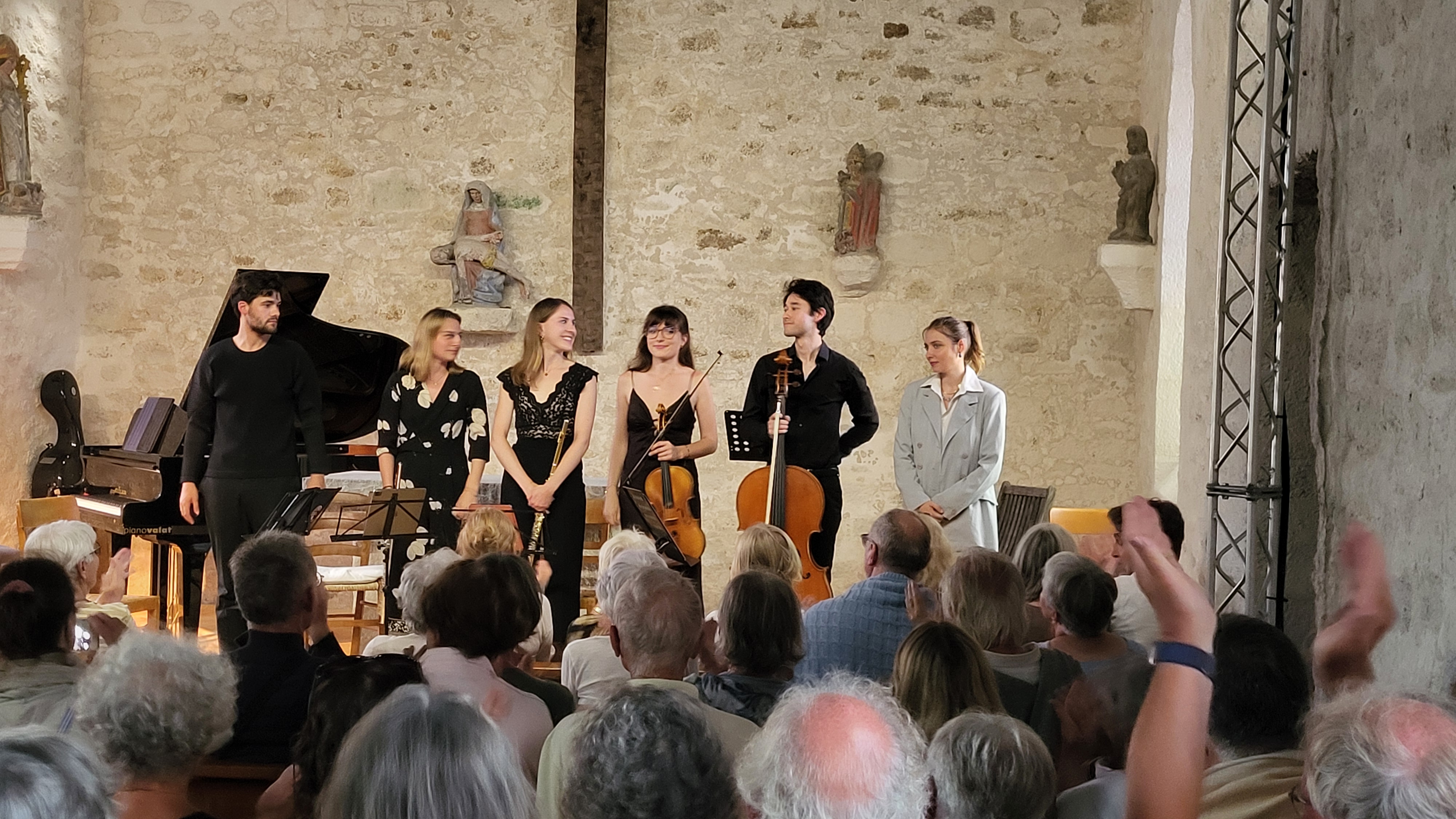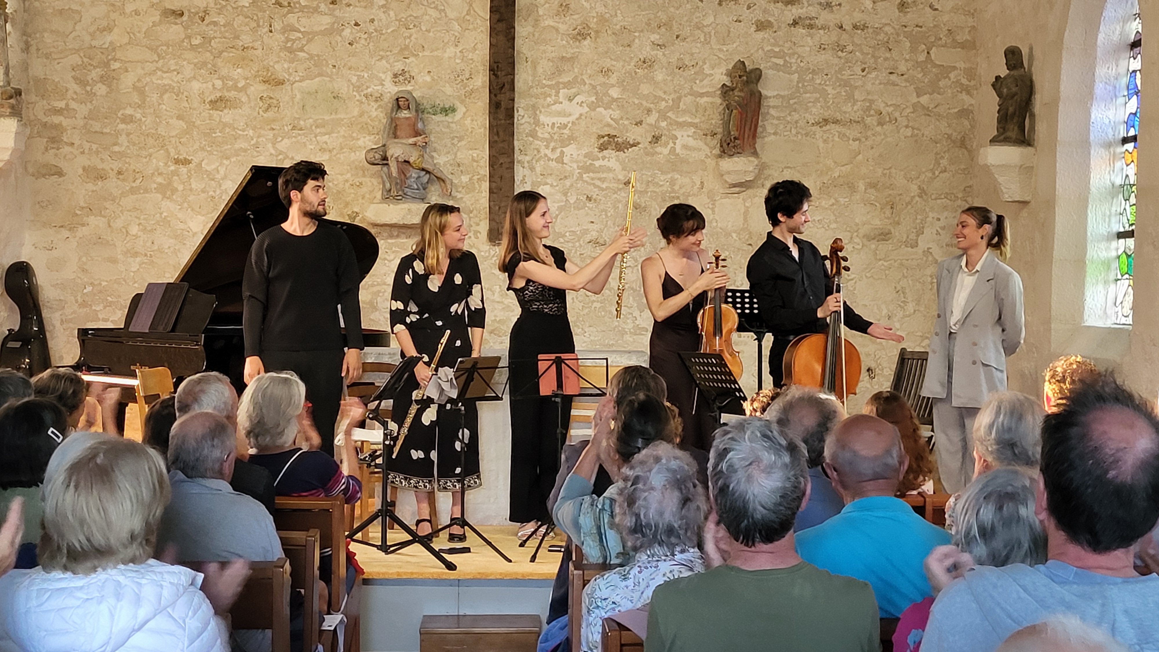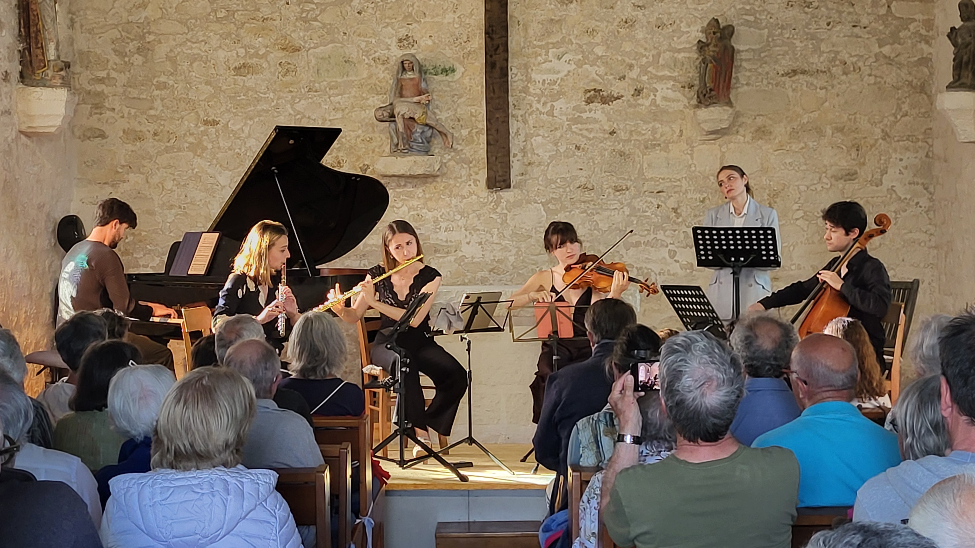 « Je souhaite raconter une histoire en musique comme un écrivain avec des mots » S. Rachmaninov. Et ce mercredi soir à la chapelle Pol, nous avons eu les deux, la musique et les mots. Dans un texte fort, émouvant et poétique écrit par Adrien Gey-Galera, le pianiste de l’Ensemble Daphnis et dit par Lula Cotton-Frapier, on a découvert des moments emblématiques de la vie de ce musicien extraordinaire qu’était Rachmaninov de son talent de compositeur mais aussi d’interprète : ses ressentis dans la nature, son amour de la steppe et de sa terre russe, ses émotions au son des cloches, les seuls instruments de musique des église russes… Des souvenirs, des émotions traduites notamment dans ses suites pour piano que l’ensemble Daphnis a transcrites. Tous sont des jeunes talents magnifiques dont certains déjà reconnus – Iris Daverio est flûte soliste de l’orchestre de l’Opéra de Paris, Coline Moreau, altiste a été retenue par Gautier Capuçon pour sa tournée « un été en France », Alec Fukuda, violoncelle, a été lauréat du concours international de violoncelle de Rio de Janeiro, Perrine Chapoutot qui en plus de son talent à la flûte organise un festival de musique classique à Tours… Une belle réussite collective aussi pour l’association avec des adhérents motivés et disponibles qui ont conduit, hébergé, accompagné les musiciens ! Rachmaninov décrivait la fête de Pâques de sa jeunesse en Russie comme un moment exceptionnel de joie, de rencontres, de bonheur, de musiques « On dirait que c’est l’air lui-même qui chante » Hier c’était tout l’air de la chapelle Pol qui chantait !