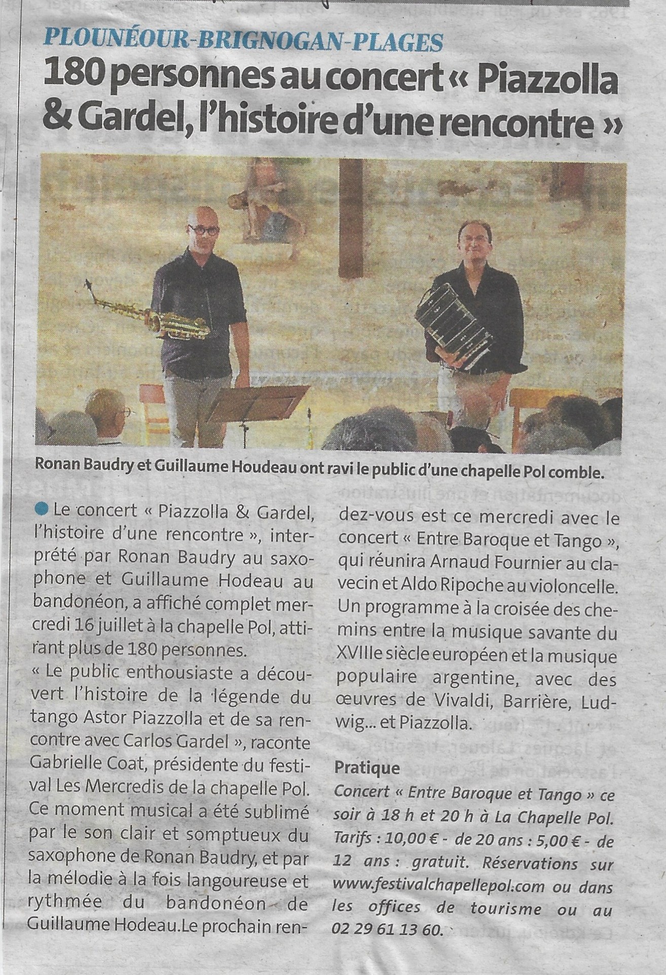 « Entre baroque et tango » ou les métamorphoses d’un clavecin ! Ce mercredi, le public de la chapelle Pol a assisté à une « uchronie » a dit Aldo Ripoche en introduction, ce concert a raconté ce qui se serait passé si Vivaldi avait rencontré Carlos Gardel. Arnaud Fournier sait tirer de son instrument un son piqué, enlevé qui virevolte et s’envole, Aldo Ripoche le suit, le complète, l’emmène parfois, au son sensuel des cordes en boyaux de son violoncelle baroque. Ils ont interprété les références de la musique baroque : Antonio Vivaldi, Jacques Duphly et même Jean-Baptiste Barrière qui fut le premier à composer pour le violoncelle en France, alors que l’Italie en jouait déjà plus d’une centaine d’années. Ils ont aussi interprété les références de la musique argentine : Carlos Gardel, Astor Piazzolla et aussi Gerardo H. Matos Rodriguez. Et ils ont conquis le public avec Cäsar de Peter Ludwig, né en 1951, qui a croisé le tango avec la musique européenne en y introduisant un rythme s’inspirant du jazz et faisant même la place à l’improvisation ! Un mot de l’Ave Maria de Piazzolla découvert par beaucoup lors du dernier concert de la chapelle Pol la semaine dernière au saxophone et au bandonéon, redécouvert ici, nouveau à la fois plus solennel et plus mystique au clavecin et au violoncelle. Magnifique !