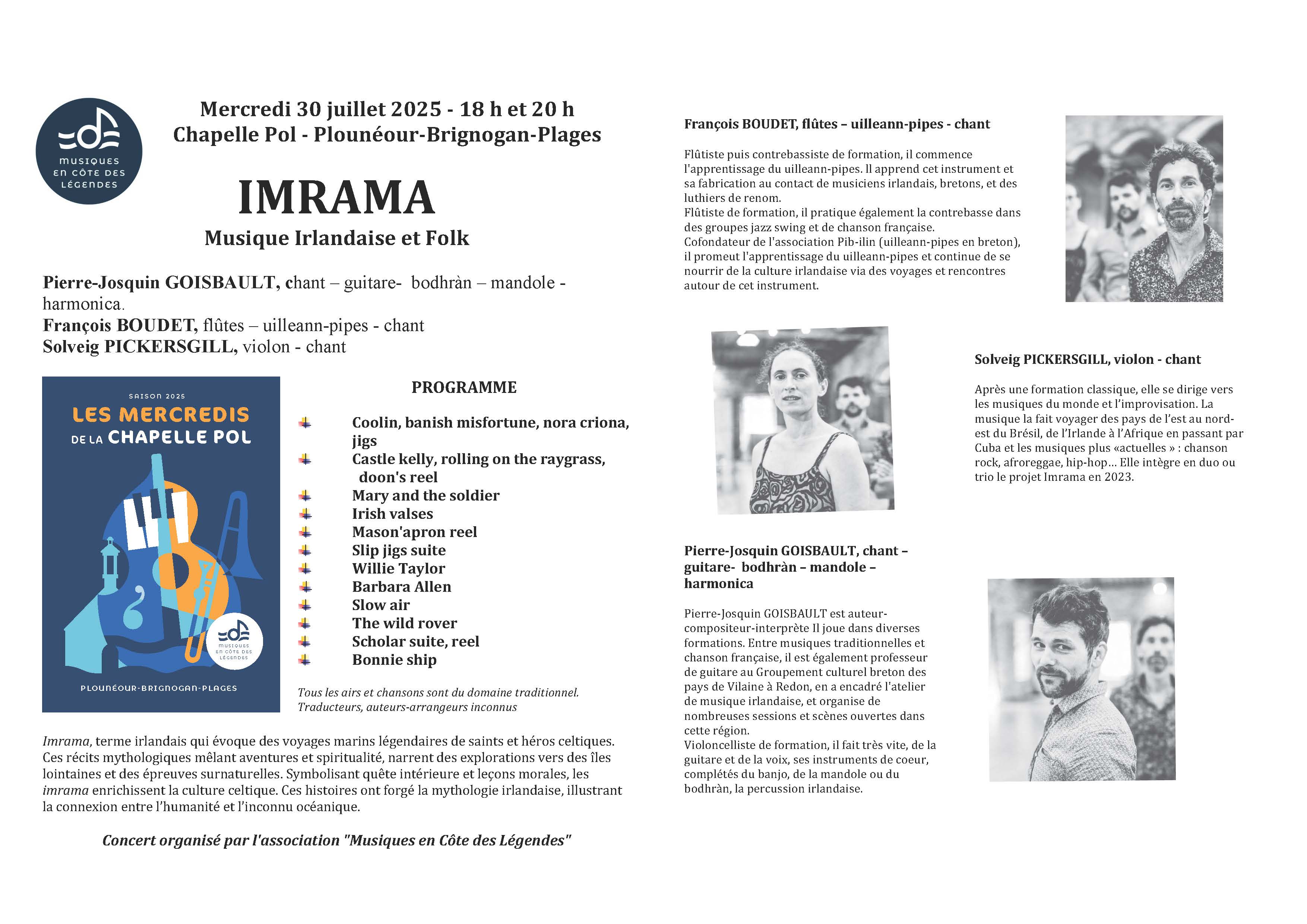 Un si beau voyage en Irlande Imrama est le terme irlandais qui évoque les voyages marins légendaires de saints et héros celtiques. C’est le mot qu’ont choisi Pierre-Josquin Goisbault, François Boudet et Solveig Pickersgill pour nommer leur ensemble, un patronyme bien mérité pour un concert où ils ont emmené le public de la chapelle Pol sur les traces de Marie La Rouge, de Willie Taylor et de Marie et de son soldat .. On a cru un moment sentir la bruine de Allihies au son de la valse écrite par François et Pierre lors du seul jour de soleil qu’ils avaient vécu lors de leur séjour dans la péninsule de Beara … mais déjà la joie de la chanson partagée et de la danse est venue rappeler la gaieté des soirées dans les pubs et la rencontre avec les amis. On assiste actuellement à un vrai renouveau de la musique irlandaise dans des soirées où les amis se retrouvent pour faire de la musique ensemble et construire autour d’un thème connu par certains une musique finalement partagée par tous. Y compris en Bretagne, puisque on a dû refuser plus de cinquante réservations après avoir rempli la chapelle pour les deux concerts ! Reel, polka, jig … au rythme du bodràn, quasiment hypnotique parfois, appuyé par la basse continue du uillean pipes, rejoint par la mélodie joyeuse ou nostalgique du violon ou le son léger de la flûte, un vrai partage de culture celtique, on n’était finalement pas trop « Far from home »