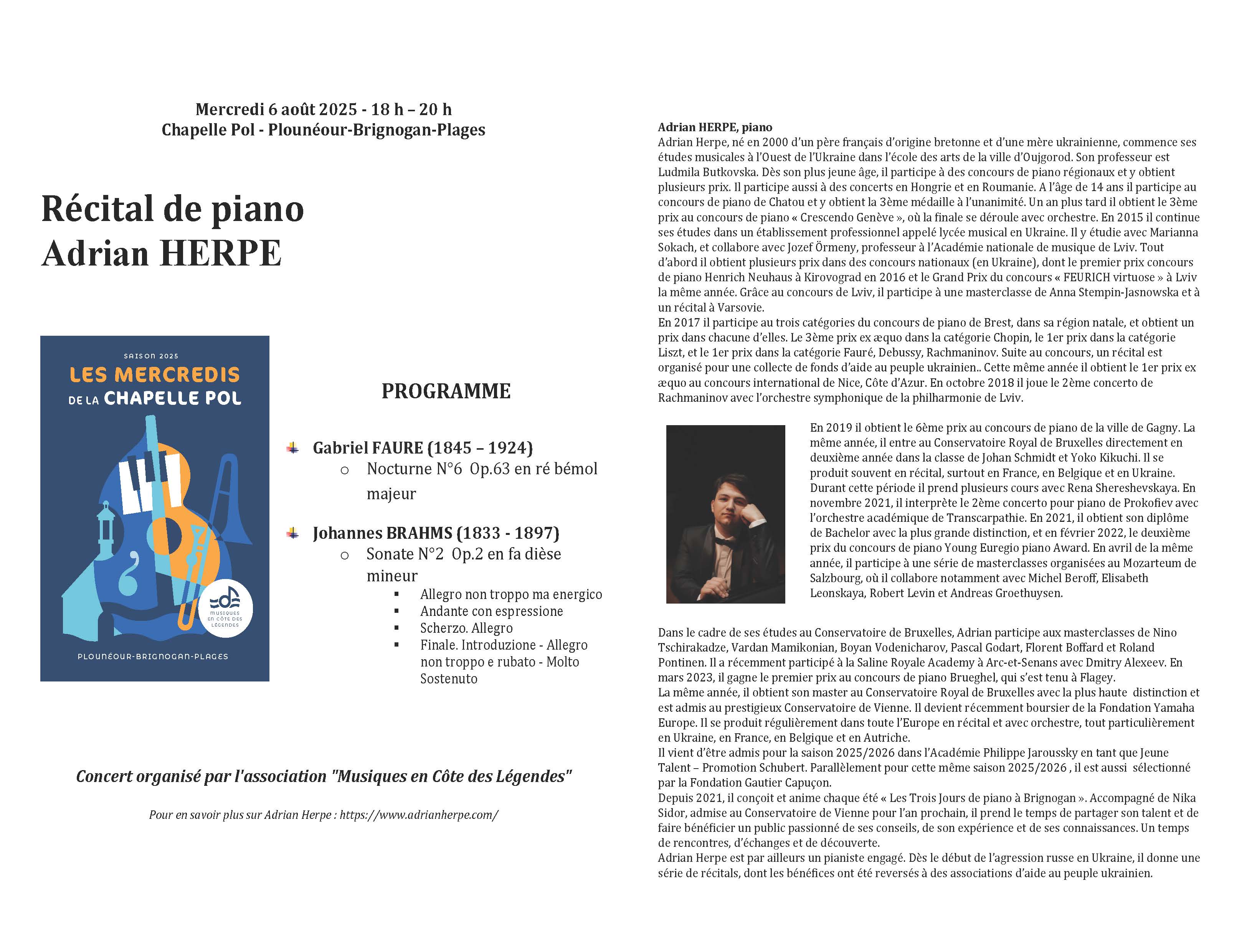 Adrian Herpe n’a pas l’habitude de présenter les programmes qu’il interprète dans le cadre des mercredis de la chapelle Pol, contrairement à ceux des Trois Jours de Piano. Mais il a pensé que le programme de cette année particulièrement exigeant pour le public nécessitait une explication ou au moins une mise en atmosphère. Et le public a particulièrement apprécié cette introduction. Le programme débute par la noblesse et la sensibilité du Nocturne n°6 de Gabriel Fauré, une œuvre qui, tournée vers le passé, regarde l’avenir. Inspiré par les fameux Nocturnes de Chopin, Fauré nous fait découvrir des harmonies aventureuses . Et sous les doigts d’Adrian Herpe, nous avons été emportés dans ce monde de sensibilité et de charme. Adrian Herpe a introduit ensuite la monumentale deuxième sonate de Brahms – vrai chef d’œuvre écrit par le compositeur seulement âgé de 19 ans. La musique est pleine de conflits et de tourments entre passion fougueuse pour Clara Schumann et sentiment de culpabilité pour Robert Schumann. Il nous a emmenés dans les méandres de la solitude, la furie et l’agitation extrême de cette œuvre. Ce fut un vrai voyage musical de plus de trente minutes rempli d’émotion. Après les tourments viennent deux bis de musique française : la première barcarolle de Gabriel Fauré nous a plongés dans la nostalgie et la valse à la manière de Borodine de Maurice Ravel nous a emportés sur une touche slave. Les deux concerts de 18h et de 20h étaient encore une fois complets, prouvant encore une fois l’attrait du public pour le haut niveau de qualité de la programmation du festival des Mercredis de la Chapelle Pol.