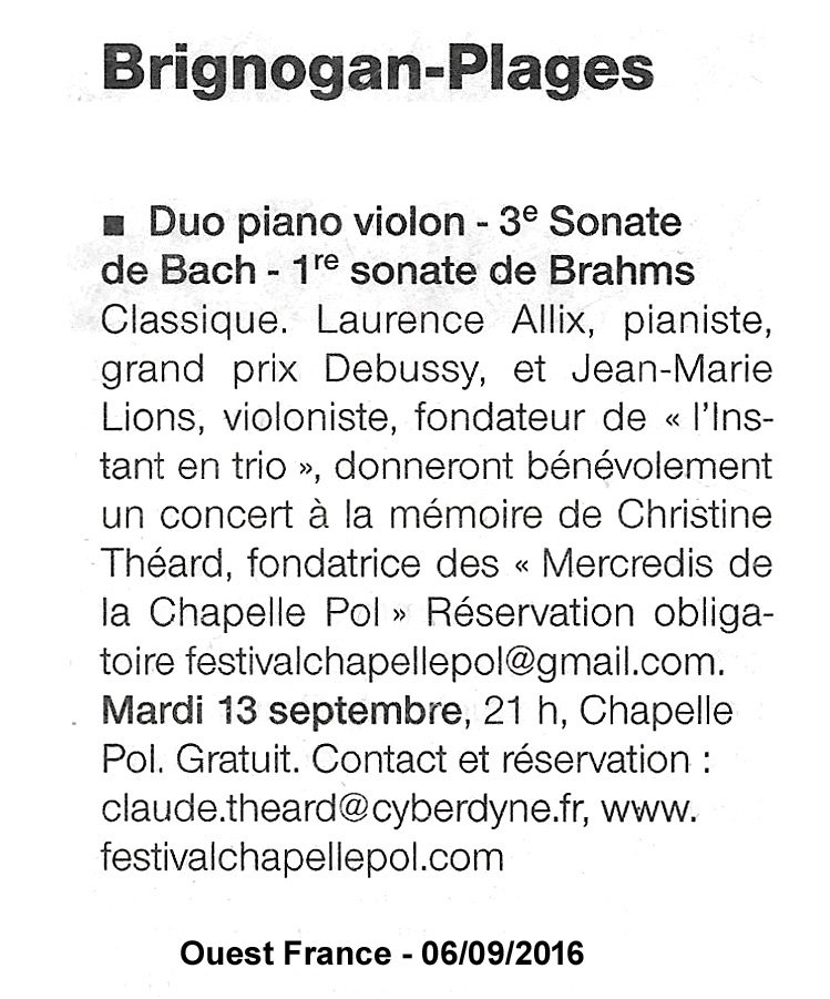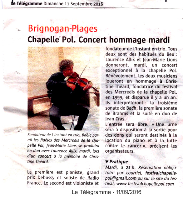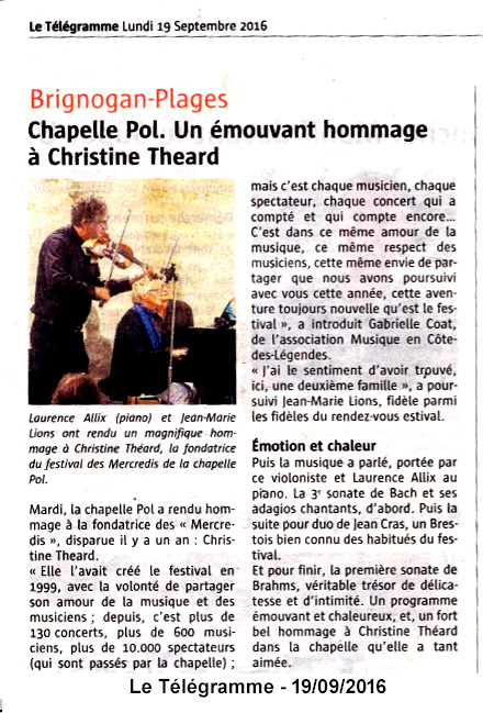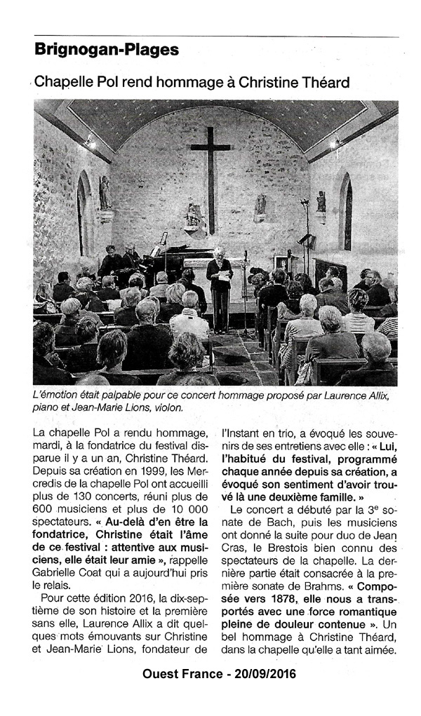 Mardi 13 septembre 2016 - Chapelle Pol - Concert en hommage à Christine Théard.