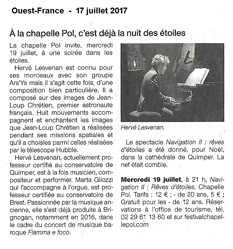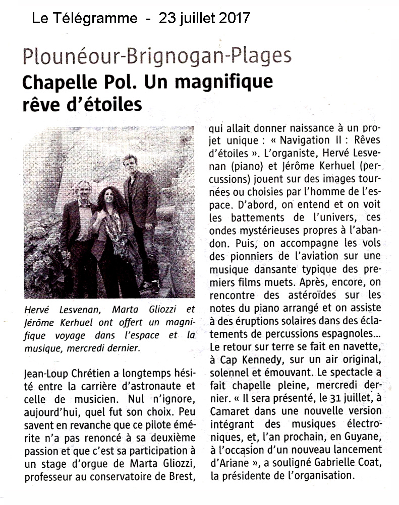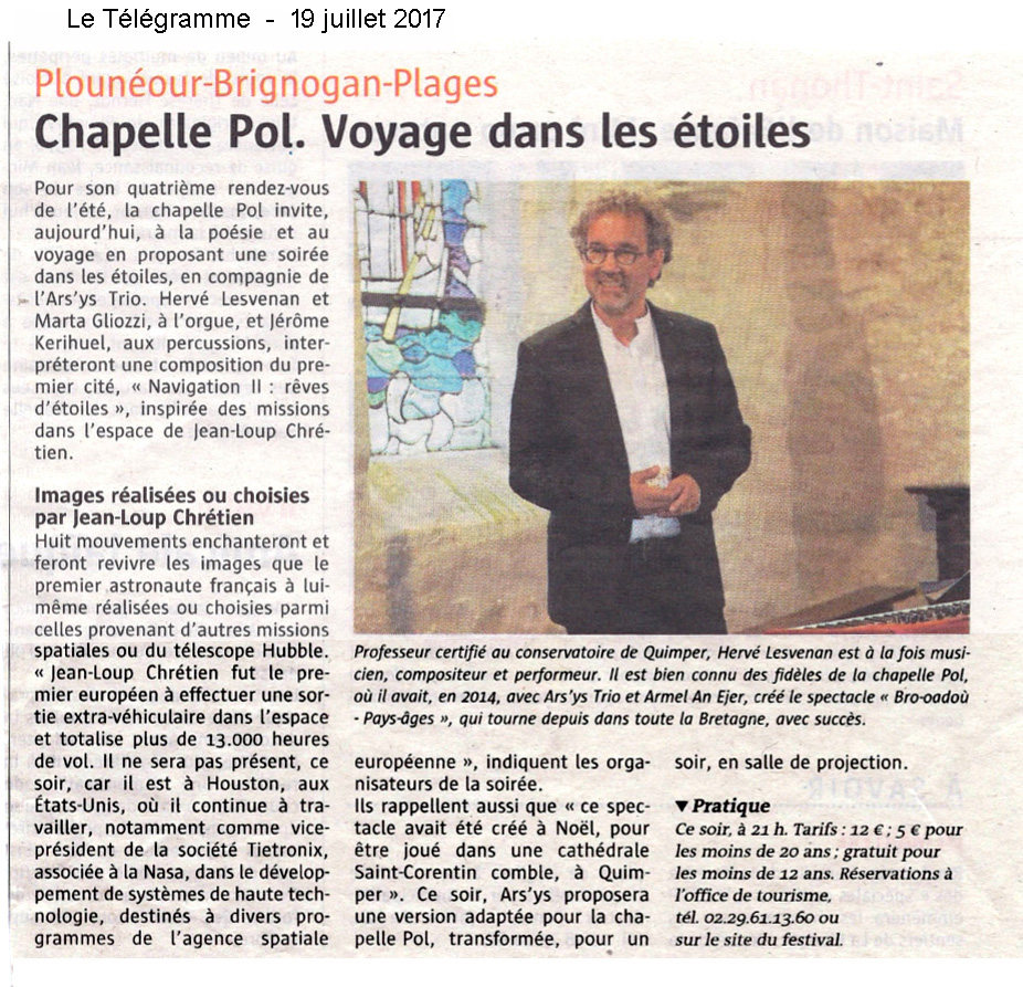 Une soirée exceptionnelle avec un video-concert proposé par Ars’ys trio : "Navigation II : Rêves d'étoiles" est une formule inédite où les mots de Jean Loup Chrétien se conjuguent avec la musique et les images. Des musiques écrites par Hervé Lesvenan se mêlent aux images du célèbre cosmonaute.