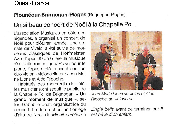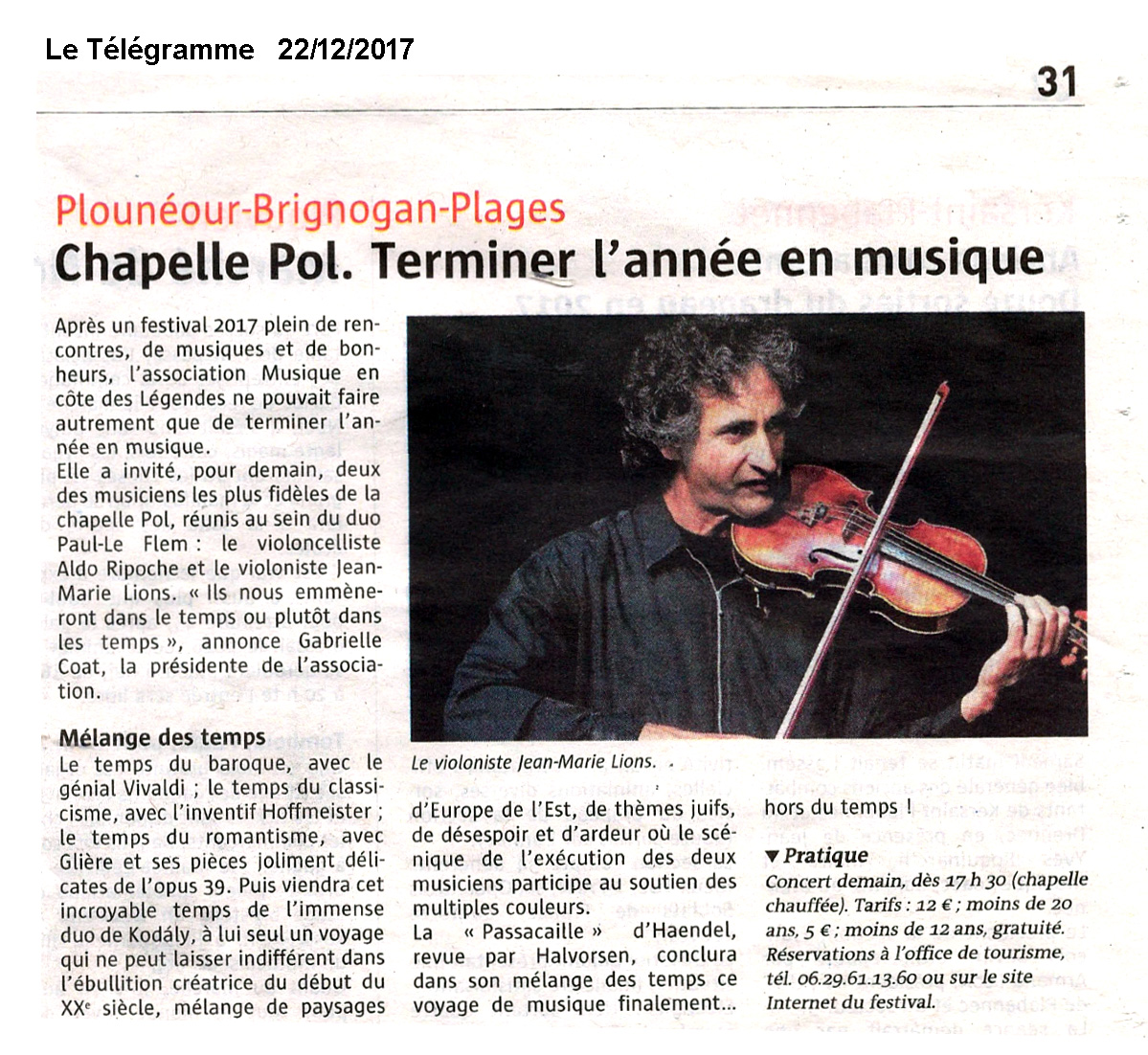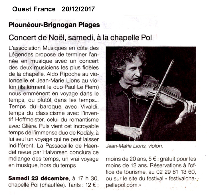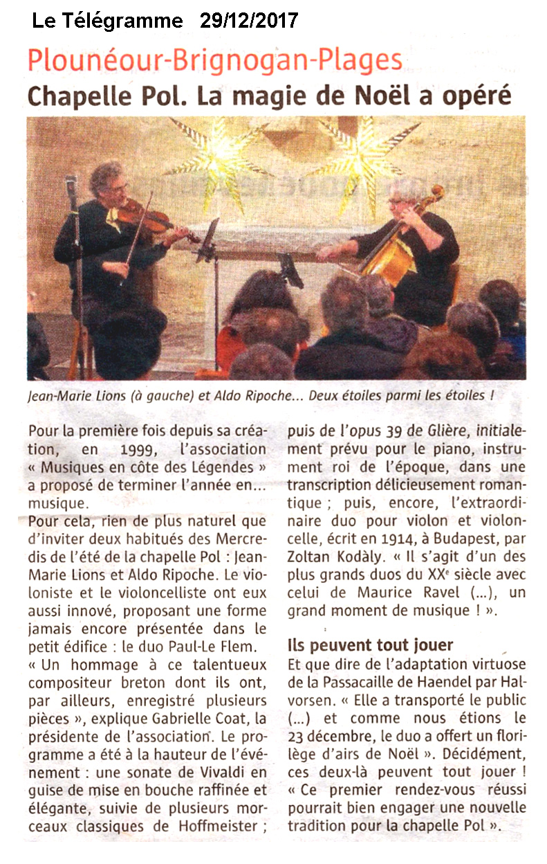 L' association "Musiques en côte des légendes", après un festival 2017 plein de rencontres, de musiques et de bonheurs termine l'année en musique avec un concert des deux musiciens les plus fidèles de la chapelle.