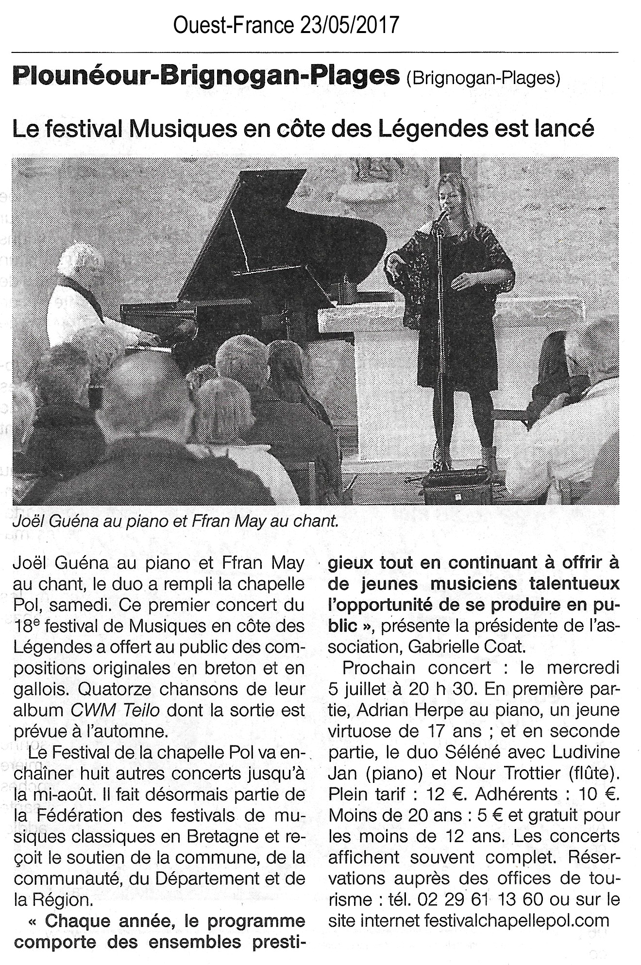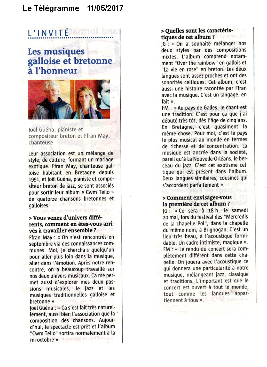 - Ffran May chanteuse et compositrice d'origine galloise et cornouaillaise, s'est produite avec de nombreux grands de la musique celtique. La collaboration actuelle avec Joël Guéna lui permet d'explorer ses plus grandes passions musicales : le jazz ainsi que les musiques traditionnelles galloise et bretonne.