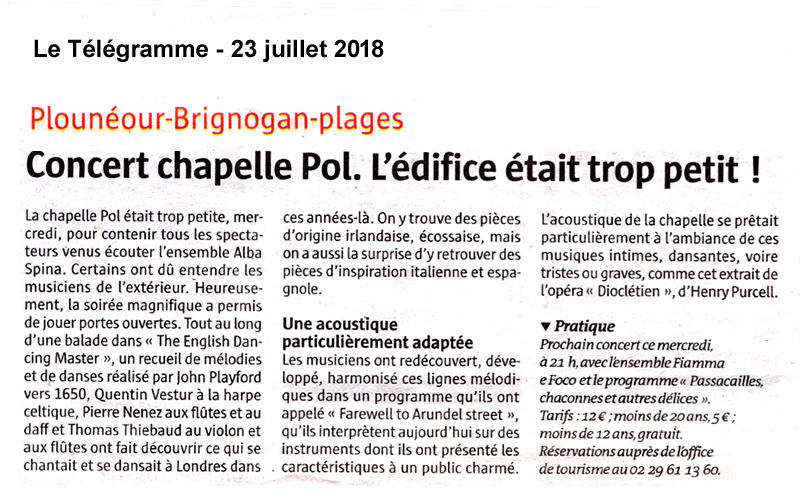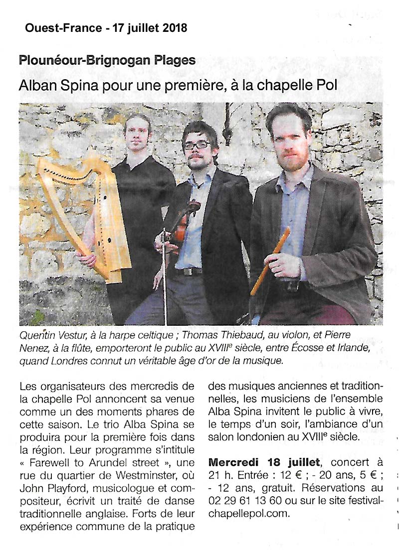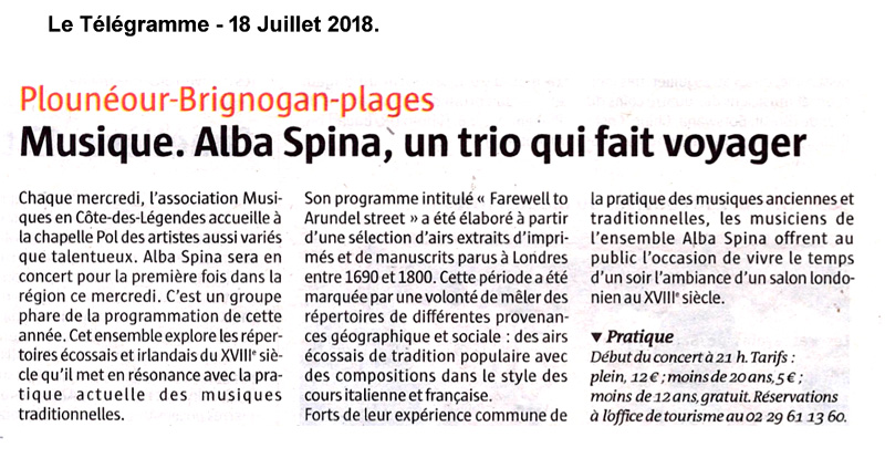 L'ensemble Alba Spina explore les répertoires écossais et irlandais du XVIIIe siècle qu'il met en résonnance avec la pratique actuelle des musiques traditionnelles. le programme que les musiciens nous ont proposé, a été élaboré à partir d'une sélection d'airs extraits d'imprimés et de manuscrits parus à Londres entre 1690 et 1800. Cette période a été marquée par une volonté de mêler les répertoires de provenances géographique et sociale diverses : des airs écossais de tradition populaire avec des compositions dans le style des cours italienne et française. Fort de leur expérience commune de la pratique des musiques anciennes et traditionnelles, les musiciens de l’ensemble Alba Spina nous ont offert de vivre le temps d’un soir l’ambiance d’un salon londonien au XVIIIe siècle.
