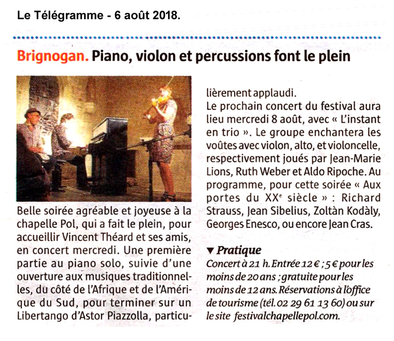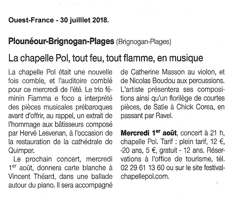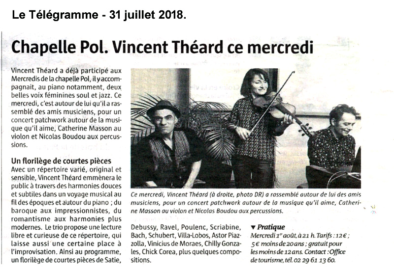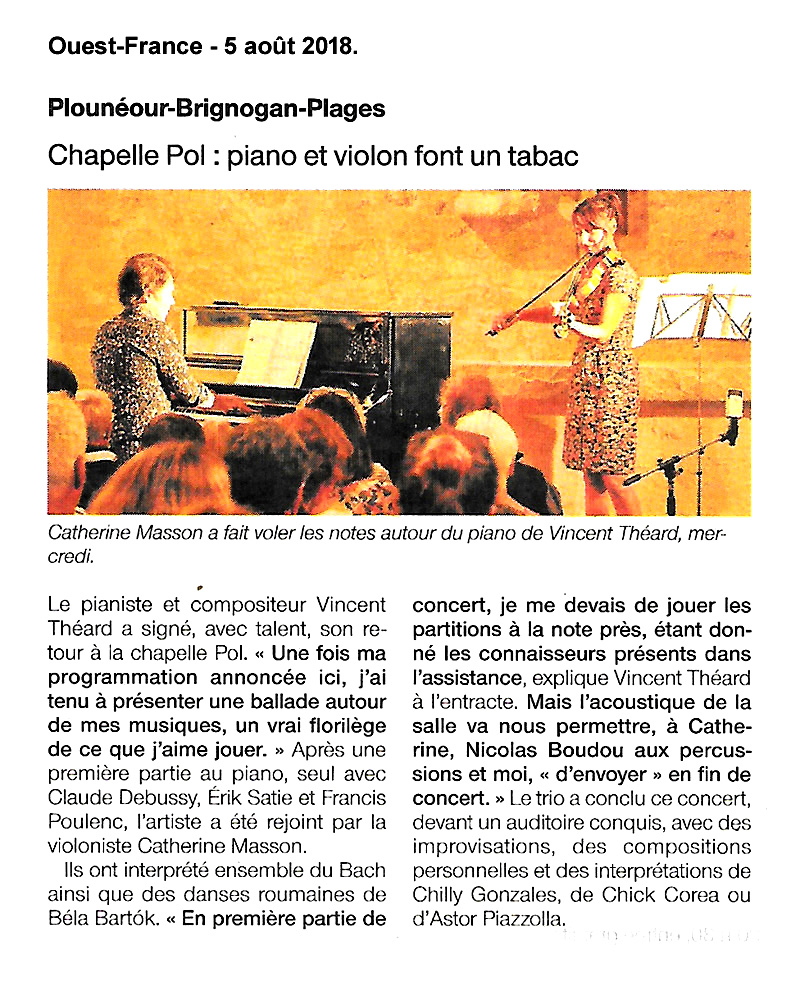 Avec un répertoire varié, original et sensible, Vincent Théard a emmené le public à travers des harmonies douces et subtiles dans un voyage musical au fil des époques et autour du piano ; du baroque (Bach) aux impressionnistes (Satie, Debussy, Ravel, Poulenc), du romantisme (Schubert) aux harmonies plus modernes (Chilly Gonzales, Chick Corea). Il était entouré de Catherine Masson au violon et de Nicolas Boudou aux percussions pour nous proposer, en trio, une lecture libre et curieuse de ce répertoire tout en laissant une certaine place pour l’improvisation.