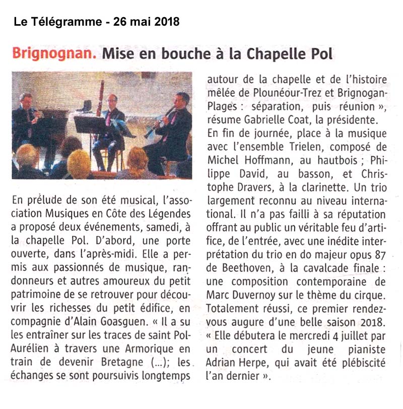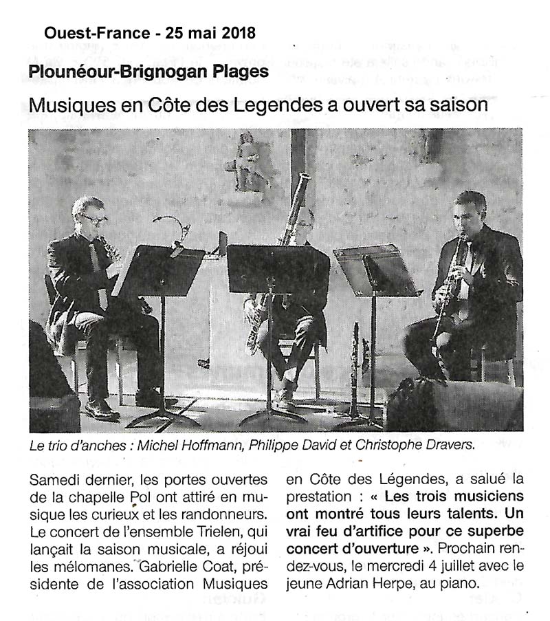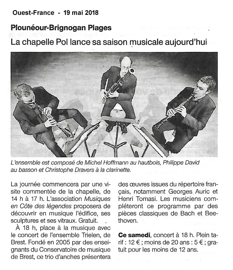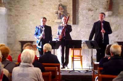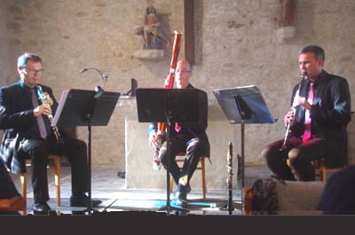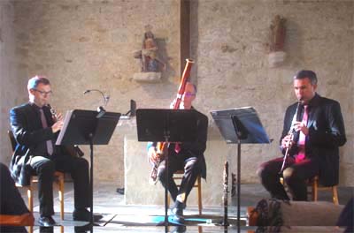 Le festival a fait fort pour ce concert d'ouverture : c'est l'ensemble Trielen, largement reconnu au niveau international qui s'est produit à 18h00 devant un beau public qui pour une part a découvert cette forme originale de composition. Le trio d'anches est en effet une des dernières formations de musique de chambre qui a été créée, les compositeurs du début du XXème siècle et notamment ceux du groupe des six ayant eu l'idée de sortir ces trois instruments de l'orchestre pour les mettre en valeur. C'est ainsi qu'ils ont composé pour la clarinette, le hautbois et le basson de petites merveilles d'harmonie et de gaieté.
