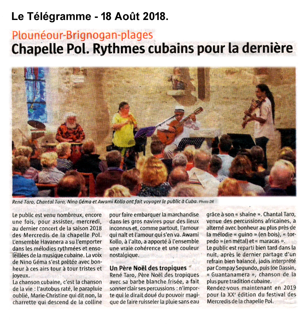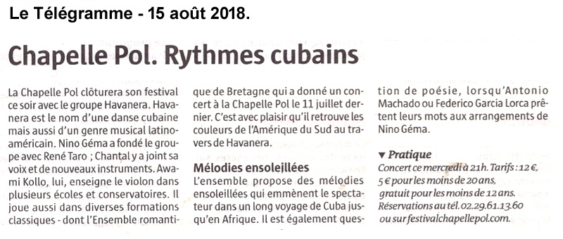 Du rythme et du soleil pour le dernier concert de la saison estivale avec le groupe Havanera. C'est sous l'impulsion de l'auteur-compositeur-interprète Nino Géma que naît le groupe à la Roche-du-Feu en 2016. Du nom de la danse cubaine mais aussi genre musical latino-américain qui se popularisa à Cuba, l'ensemble a proposé des mélodies ensoleillées qui ont emmené le public dans un long voyage de Cuba à l'Afrique du Sud. Un programme où il est également question de poésie, lorsque Antonio Machado ou Federico Garcia Lorca prêtent leurs mots aux arrangements de Nino Géma.