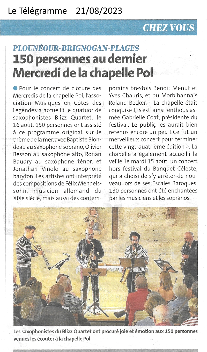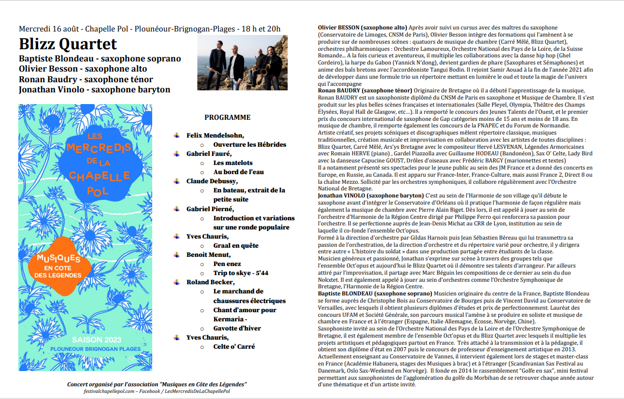 de l’été des « Mercredis de la Chapelle Pol » avec le quatuor de