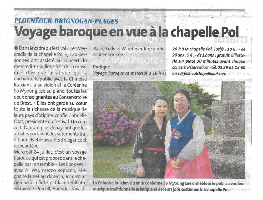 Chaque mercredi est une découverte à la chapelle Pol. Et ce 17 juillet n’a pas manqué à la tradition, il l’a même magnifiée.Ruixian Liu et So Myoung Lee vivent en France depuis plus de 20 ans, mais elles ont gardé au cœur toute la richesse de la musique de leurs pays d’origine : la Chine et la Corée.Le compositeur coréen Min-Chong Park, venu en France dans les années cinquante avait été sollicité par ses amis musiciens pour leur faire connaître sa musique traditionnelle. C’est ainsi qu’il a harmonisé, avec toute la richesse que permet la rencontre des cultures, des pièces traditionnelles coréennes tout en intégrant tout ce qu’il avait lui même découvert de la musique occidentale. Des bijoux avec un pouvoir de suggestion magique : le piano et le violon nous emmènent avec lui au bord de ce fleuve tranquille ...Autre pièce au programme : « Les amants papillons », des extraits d’une transcription pour piano et violon de cet opéra composé en 1959 par le compositeur chinois Chen Gang. Le livret raconte l’histoire de ces deux amants qui tels Roméo et Juliette ne pourront vivre leur amour. On suit la marche inexorable vers le drame. Mais ils se retrouveront dans la mort, métamorphosés en papillons à qui la note suspendue de l’archet de Riuxian Liu a donné vie.Le talent des artistes, actuellement toutes deux enseignantes au Conservatoire de musique de Brest, s’est aussi exprimé dans la si belle et si complexe sonate n°3 de Debussy, et pour finir, en bis avec une « Habanera » de Jean Cras, pleine de poésie, de nostalgie et aussi de souvenirs de lointains rivages.Un concert d’autant plus dépaysant que les artistes portaient des vêtements traditionnels éblouissants d’élégance et de beauté.
