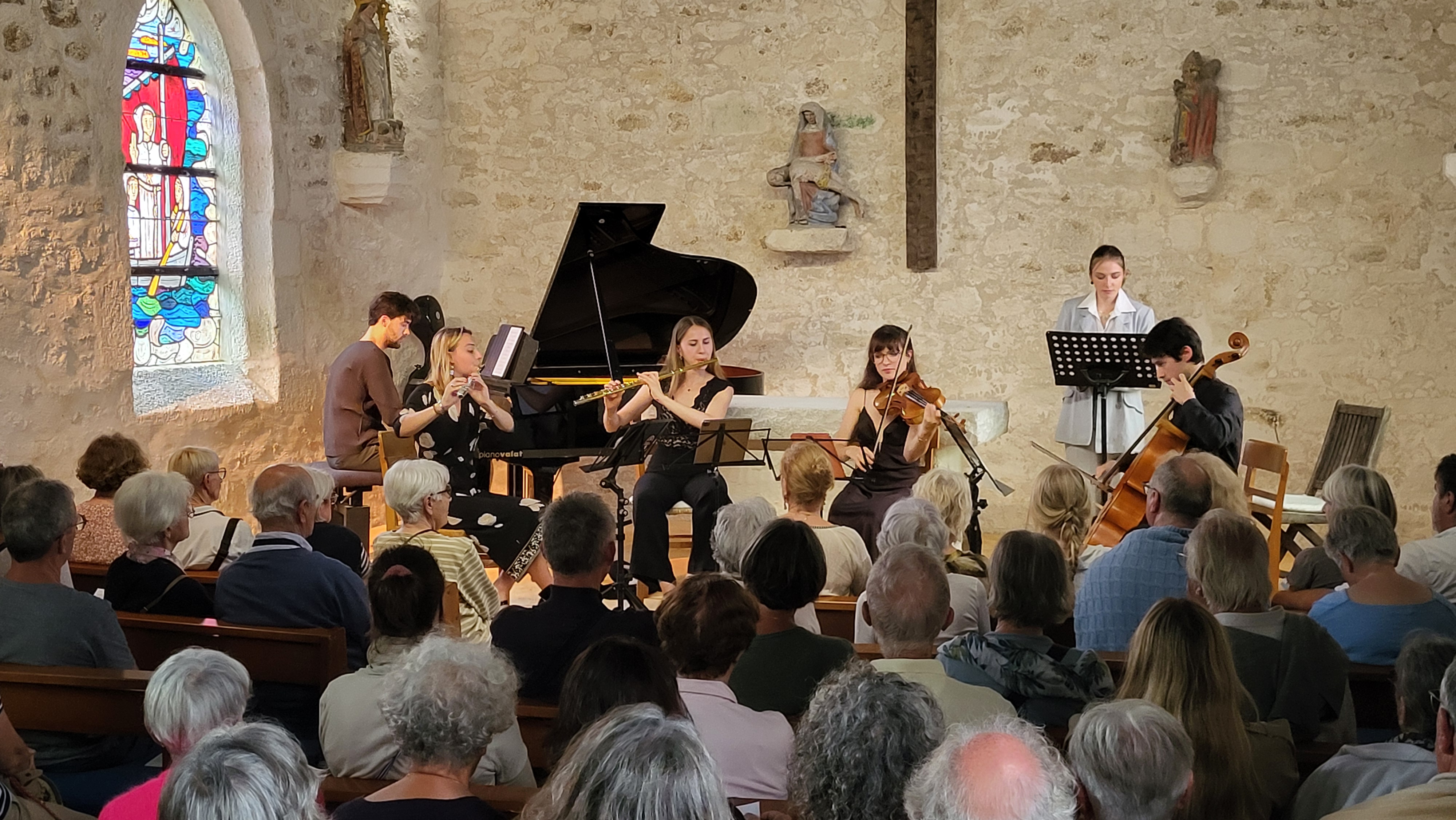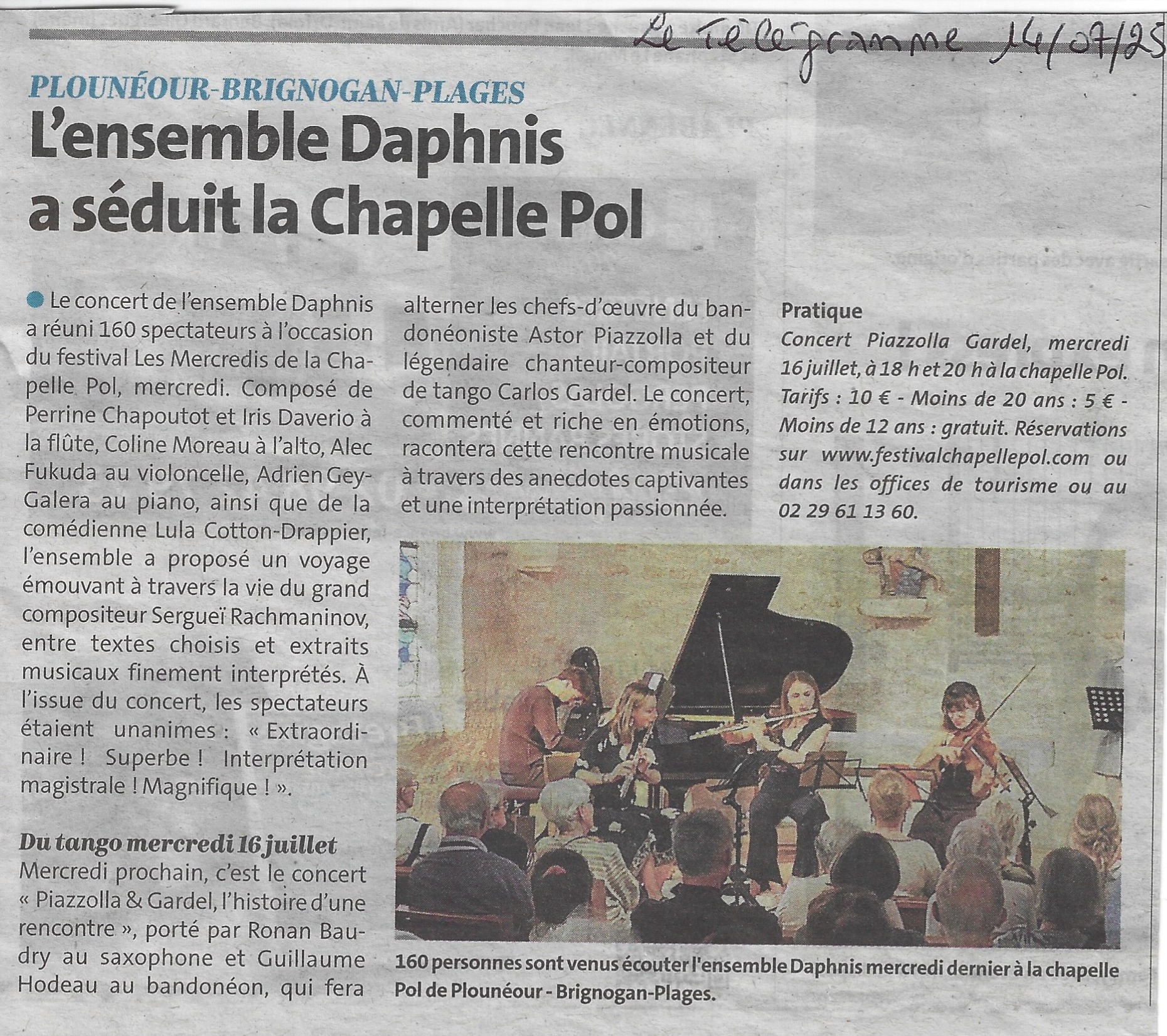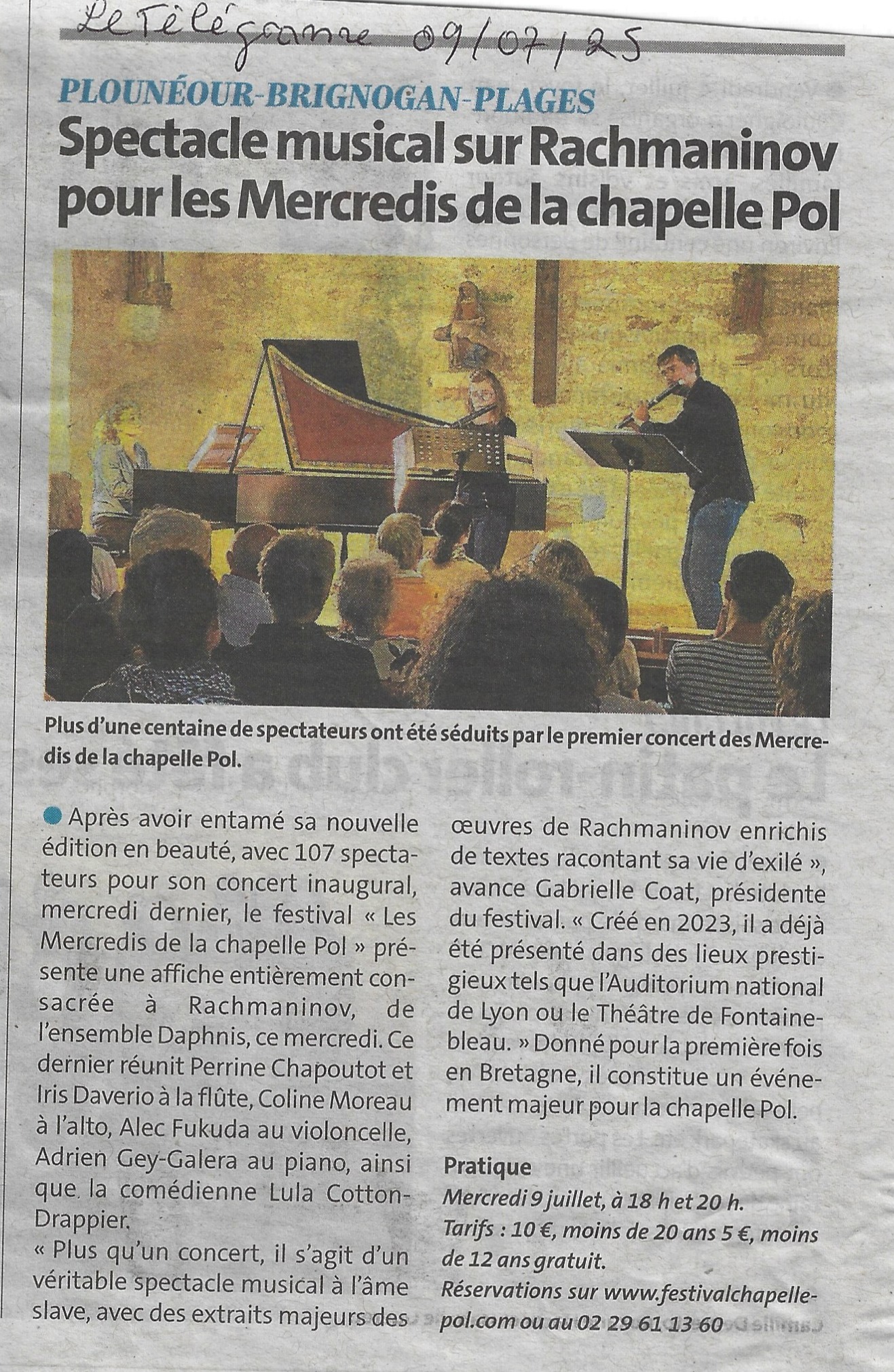 « Je souhaite raconter une histoire en musique comme un écrivain avec des mots » S. Rachmaninov. Et ce mercredi soir à la chapelle Pol, nous avons eu les deux, la musique et les mots. Dans un texte fort, émouvant et poétique écrit par Adrien Gey-Galera, le pianiste de l’Ensemble Daphnis et dit par Lula Cotton-Frapier, on a découvert des moments emblématiques de la vie de ce musicien extraordinaire qu’était Rachmaninov de son talent de compositeur mais aussi d’interprète : ses ressentis dans la nature, son amour de la steppe et de sa terre russe, ses émotions au son des cloches, les seuls instruments de musique des église russes… Des souvenirs, des émotions traduites notamment dans ses suites pour piano que l’ensemble Daphnis a transcrites. Tous sont des jeunes talents magnifiques dont certains déjà reconnus – Iris Daverio est flûte soliste de l’orchestre de l’Opéra de Paris, Coline Moreau, altiste a été retenue par Gautier Capuçon pour sa tournée « un été en France », Alec Fukuda, violoncelle, a été lauréat du concours international de violoncelle de Rio de Janeiro, Perrine Chapoutot qui en plus de son talent à la flûte organise un festival de musique classique à Tours… Une belle réussite collective aussi pour l’association avec des adhérents motivés et disponibles qui ont conduit, hébergé, accompagné les musiciens ! Rachmaninov décrivait la fête de Pâques de sa jeunesse en Russie comme un moment exceptionnel de joie, de rencontres, de bonheur, de musiques « On dirait que c’est l’air lui-même qui chante » Hier c’était tout l’air de la chapelle Pol qui chantait !