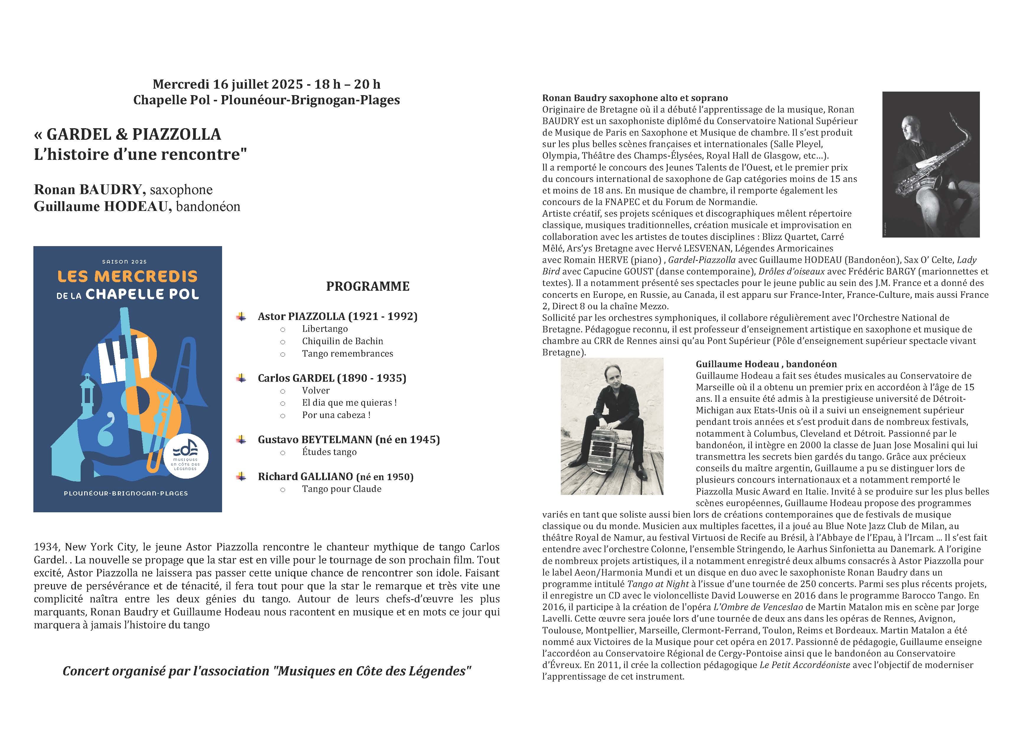 MUSIQUES EN CÔTE DES LÉGENDES Les mercredis de la chapelle Pol |
