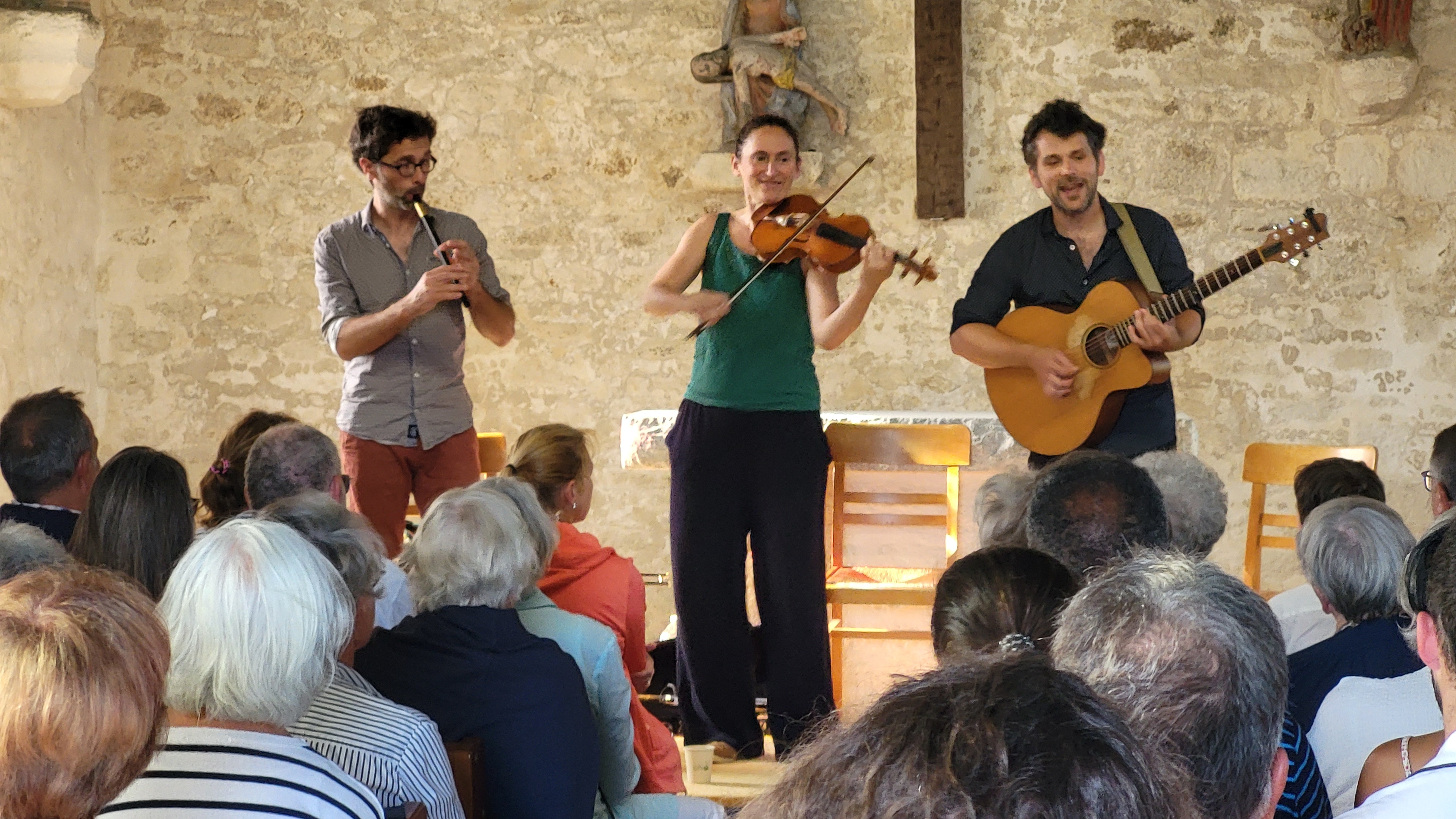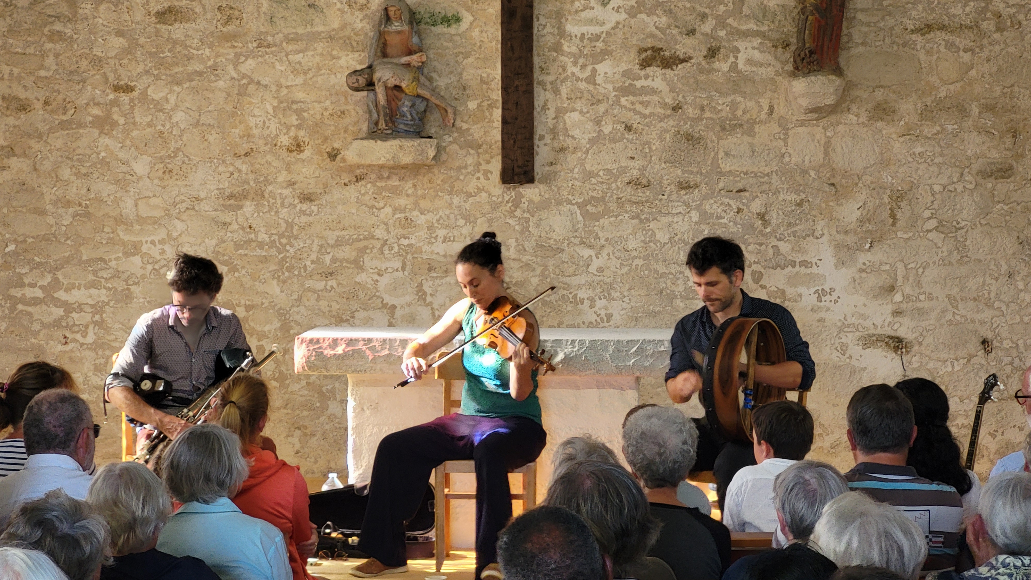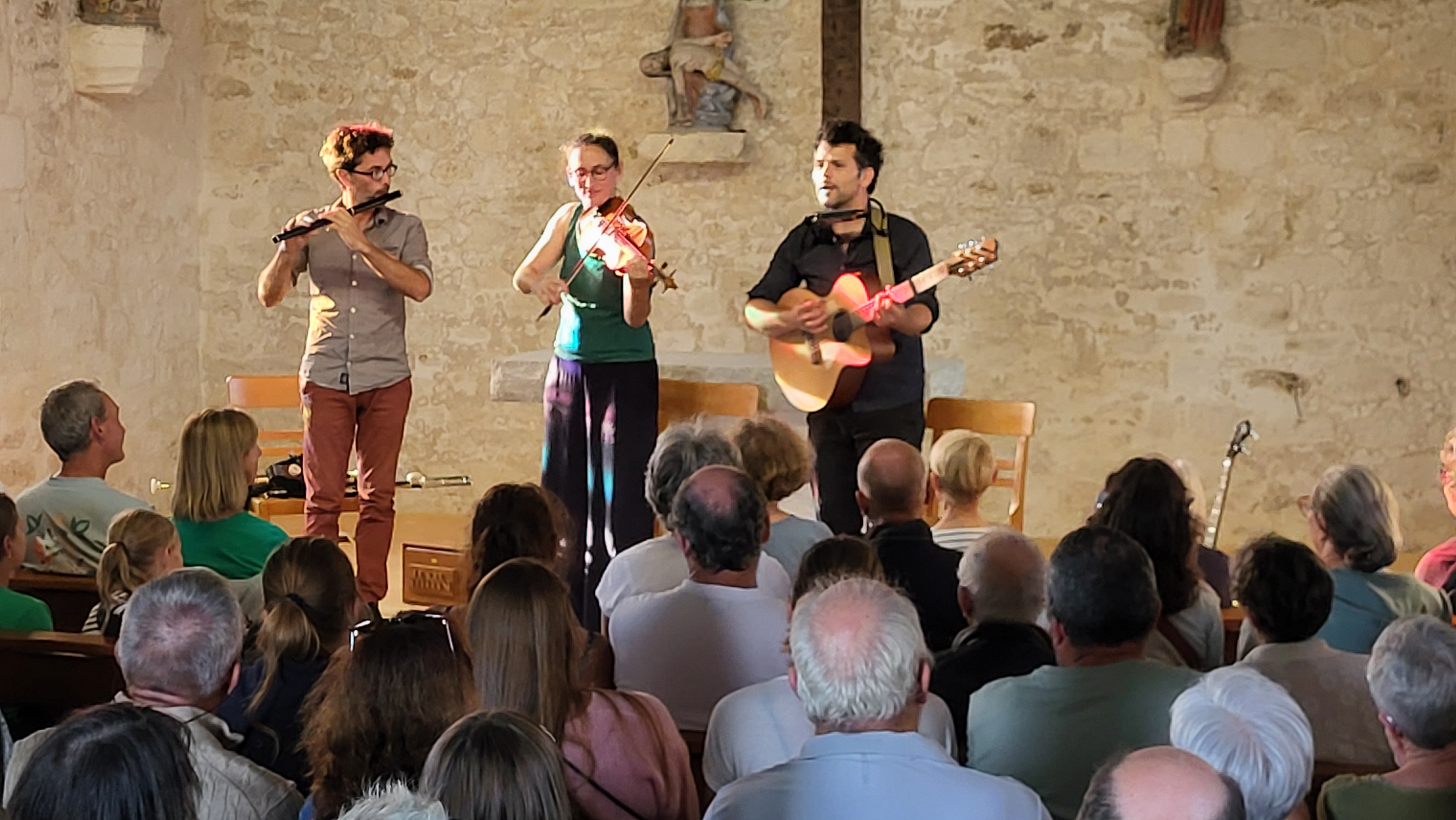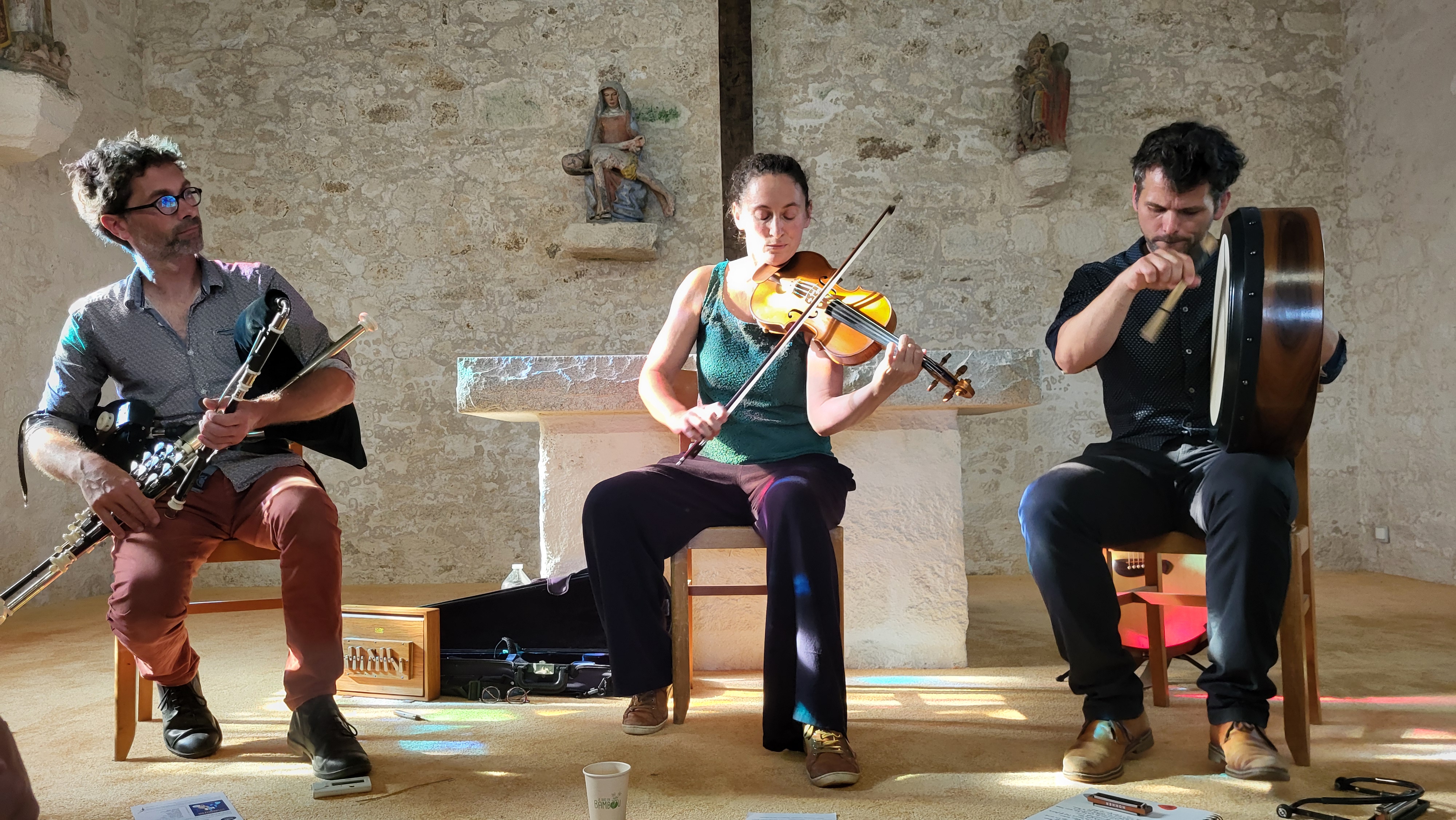 Un si beau voyage en Irlande Imrama est le terme irlandais qui évoque les voyages marins légendaires de saints et héros celtiques. C’est le mot qu’ont choisi Pierre-Josquin Goisbault, François Boudet et Solveig Pickersgill pour nommer leur ensemble, un patronyme bien mérité pour un concert où ils ont emmené le public de la chapelle Pol sur les traces de Marie La Rouge, de Willie Taylor et de Marie et de son soldat .. On a cru un moment sentir la bruine de Allihies au son de la valse écrite par François et Pierre lors du seul jour de soleil qu’ils avaient vécu lors de leur séjour dans la péninsule de Beara … mais déjà la joie de la chanson partagée et de la danse est venue rappeler la gaieté des soirées dans les pubs et la rencontre avec les amis. On assiste actuellement à un vrai renouveau de la musique irlandaise dans des soirées où les amis se retrouvent pour faire de la musique ensemble et construire autour d’un thème connu par certains une musique finalement partagée par tous. Y compris en Bretagne, puisque on a dû refuser plus de cinquante réservations après avoir rempli la chapelle pour les deux concerts ! Reel, polka, jig … au rythme du bodràn, quasiment hypnotique parfois, appuyé par la basse continue du uillean pipes, rejoint par la mélodie joyeuse ou nostalgique du violon ou le son léger de la flûte, un vrai partage de culture celtique, on n’était finalement pas trop « Far from home »